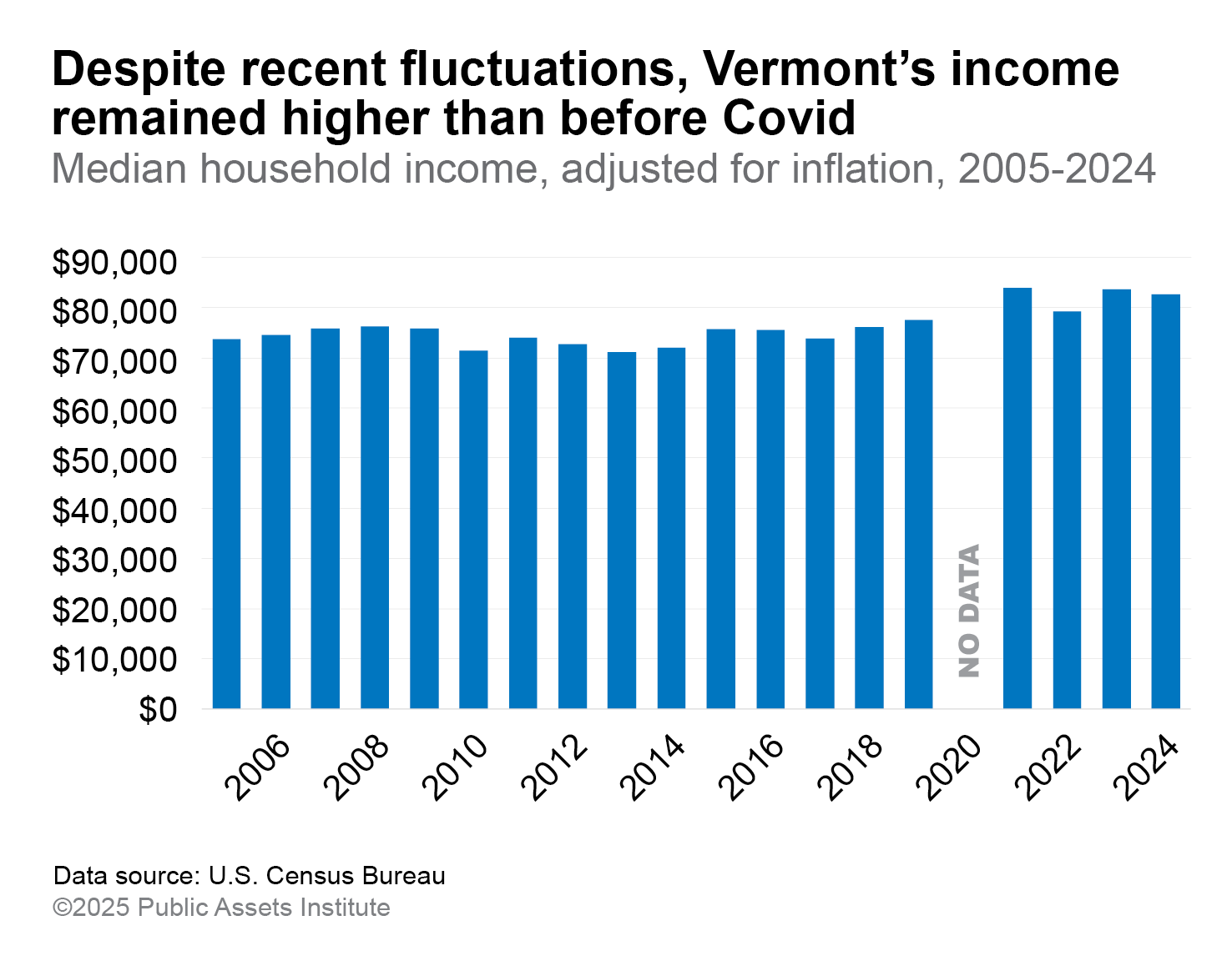Newly released U.S. Census data show that Vermont’s median annual income decreased last year to $82,730 after adjusting for inflation. While this change was not statistically significant, Vermont was one of only six states nationwide where income declined. Only North Dakota and Rhode Island saw sharper drops. This marks a departure from the income growth Vermont experienced immediately after the start of the Covid pandemic: a rise of over 8 percent between 2019 and 2021, the fastest growth in the country. Most of those gains have endured. But aside from that period, income in the state has generally stagnated. From the early aughts to 2019, income hovered around $75,000. And since 2021, it has stayed flat at around $82,000.