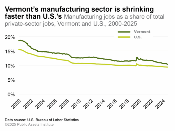 Manufacturing jobs have been declining for decades—and that decline has been bigger in Vermont than the nation overall.