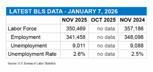 Employment is a count of individuals who are working, including those who are self-employed. The number of people working is different from the count of jobs. For example, one individual can hold more than one job. While the number of working Vermonters dropped in 2025, employers did increase the number of jobs between December 2024 and November 2025. Still, Vermont has not recovered the jobs lost during the pandemic.