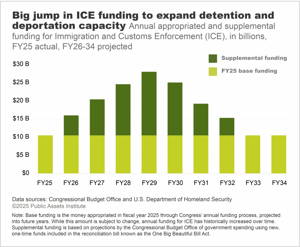 ICE received nearly $75 billion in supplemental funding, including $45 billion for constructing and expanding detention centers and nearly $30 billion for hiring 10,000 new employees—a boost of 50 percent compared to current staffing levels. This one-time funding is in addition to annual funds passed through the appropriations process; in Fiscal Year (FY) 2025, Congress appropriated over $10 billion in base funding for ICE. While this base amount could change in future years, it has historically increased over time. These combined investments are expected to double immigration detention capacity from more than 50,000 beds to over 100,000, including through the construction of new family detention facilities and “mega-facilities”.